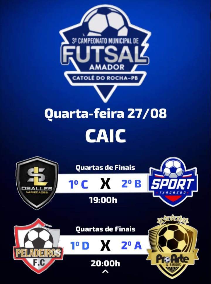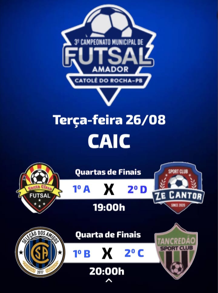 O 3º Campeonato Municipal de Futsal Amador de Catolé do Rocha chega à sua fase de quartas de final, prometendo dois dias de grandes confrontos na quadra do CAIC.