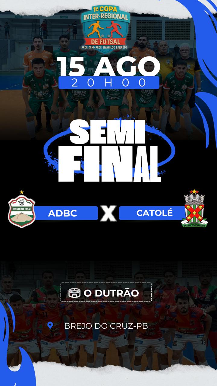 A emoção da 1ª Copa Inter-Regional de Futsal – Professores Deni e Zivanildo Barreto – chega a um dos momentos mais aguardados: a fase semifinal. Nesta sexta-feira, 15 de agosto, às 20h, o ginásio O Dutrão, em Brejo do Cruz-PB, será palco do confronto decisivo entre ADBC e Catolé.