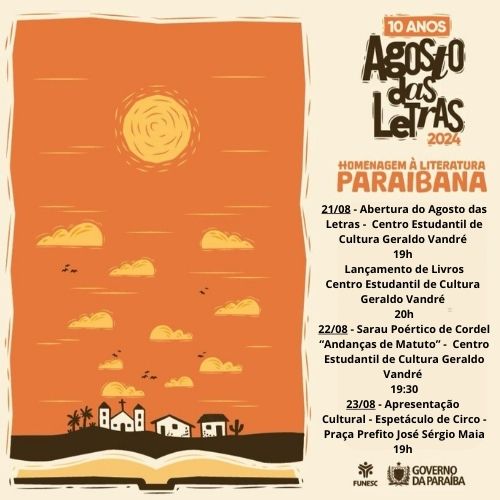 A Fundação Espaço Cultural da Paraíba – FUNESC, em parceria com a Prefeitura Municipal de Catolé do Rocha, através da Secretaria de Cultura e Turismo, convida a todos para participarem do AGOSTO DAS LETRAS, um evento literário e cultural que acontecerá de 21 a 23 de Agosto