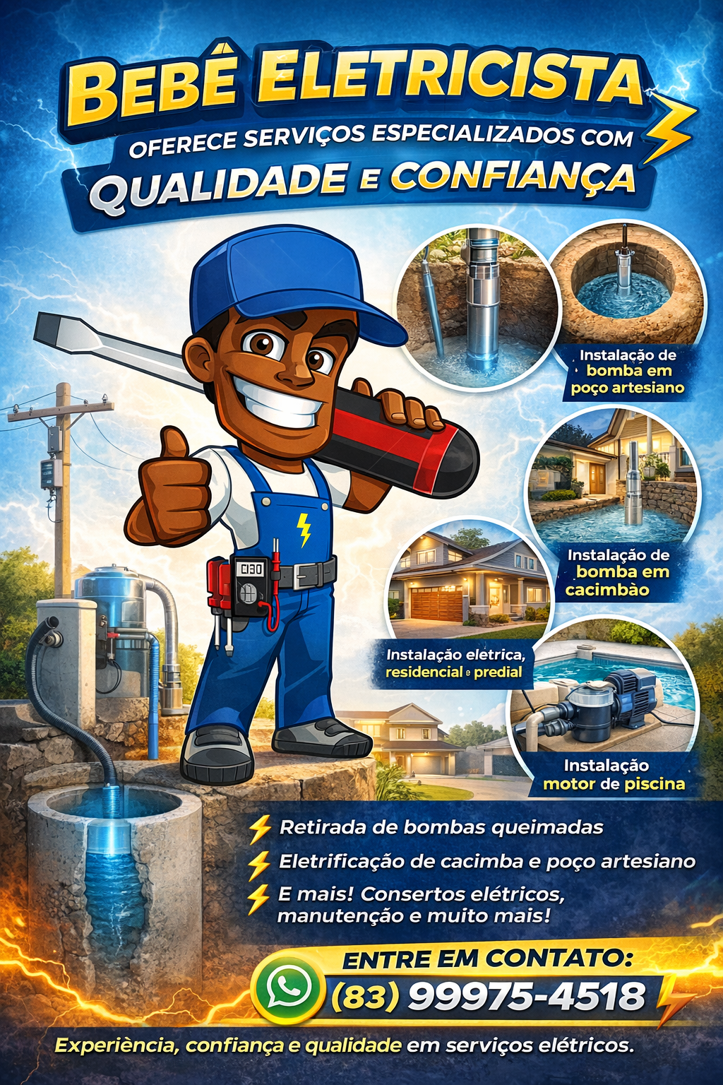 Entre os serviços oferecidos, destacam-se ainda a instalação de bomba em cacimbão, a instalação elétrica completa de casas e prédios, além da implantação de rede elétrica em poste para cacimbão e bombas em poços artesianos, sempre obedecendo às normas técnicas e aos padrões de segurança.