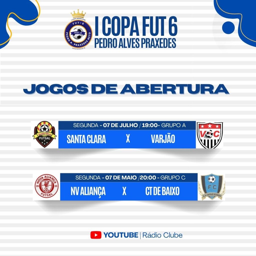 Pelo Grupo A, às 19h, Santa Clara enfrenta o Varjão no jogo inaugural. Em seguida, pelo Grupo C, será a vez de Nova Aliança encarar a tradicional equipe de Catolé de Baixo.