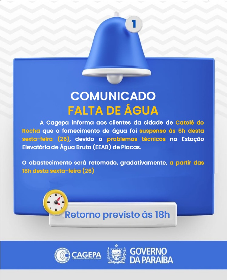 A Companhia de Água e Esgotos da Paraíba (Cagepa) informou que o fornecimento de água na cidade de Catolé do Rocha foi suspenso às 6h da manhã desta sexta-feira (26). De acordo com o comunicado, a interrupção ocorreu devido a problemas técnicos na Estação Elevatória de Água Bruta (EEAB) de Placas.