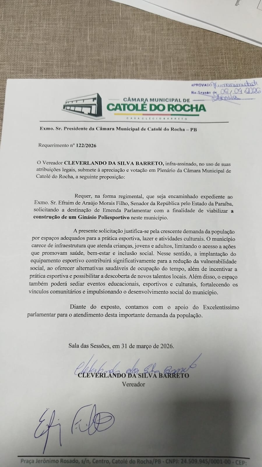No documento, o vereador solicita ao senador Efraim Filho a destinação de emenda parlamentar para a construção de um ginásio poliesportivo em Catolé do Rocha.