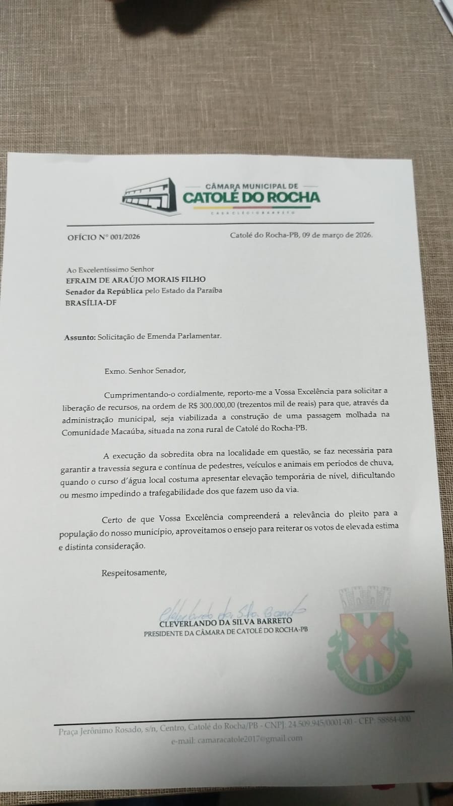 Documentos apresentados pelo parlamentar mostram duas importantes solicitações encaminhadas ao senador Efraim Filho, ambas voltadas ao fortalecimento da infraestrutura local: a construção de uma passagem molhada na comunidade Macaúba e a destinação de recursos para um ginásio poliesportivo em Catolé do Rocha.