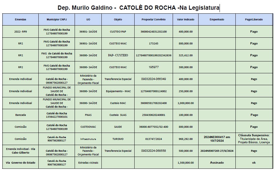 A conquista desses recursos é resultado das viagens e articulações realizadas pelo prefeito Laurinho Maia e pela primeira-dama Geska Maia em Brasília, buscando garantir investimentos que impactam diretamente a vida da população. Entre os principais parlamentares responsáveis pelas indicações está o deputado federal Murilo Galdino, que destinou valores significativos para o município.