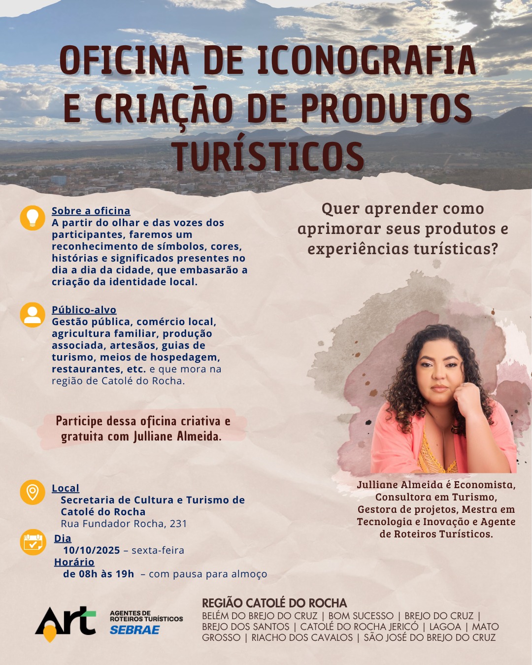 Catolé do Rocha vai reunir, no dia 10 de outubro, agentes do turismo, gestores públicos, produtores locais e artesãos para a Oficina de Iconografia e Criação de Produtos Turísticos. O encontro prático acontece no Centro de Cultura, das 8h às 19h, com pausa para almoço. O evento é gratuito, mas as vagas são limitadas — as inscrições devem ser feitas pelo formulário online.