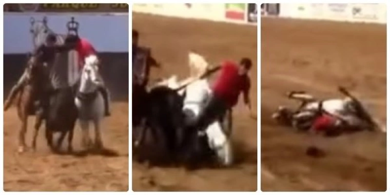 Vídeos que circulam nas redes sociais mostram o momento em que dois vaqueiros, montados em seus cavalos, tentam realizar a derrubada do boi na faixa. Em determinado instante, um dos animais cai sobre o próprio corpo e sofre a fratura fatal no pescoço. O vaqueiro ficou ferido.