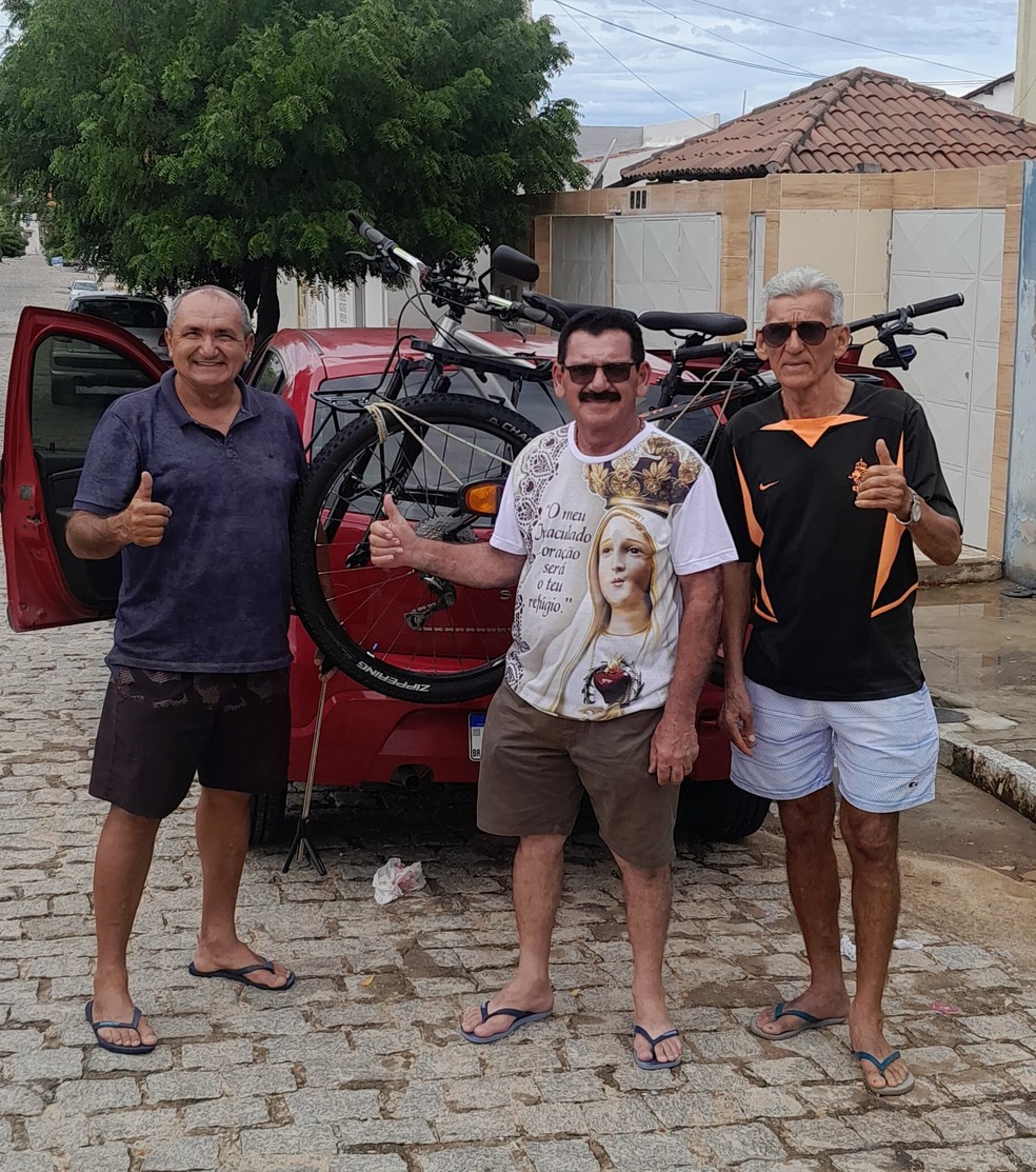 Laércio, Sebastião e Zito quando pegaram a estrada para Natal, de onde iniciaram a cicloviagem — Foto: Divulgação