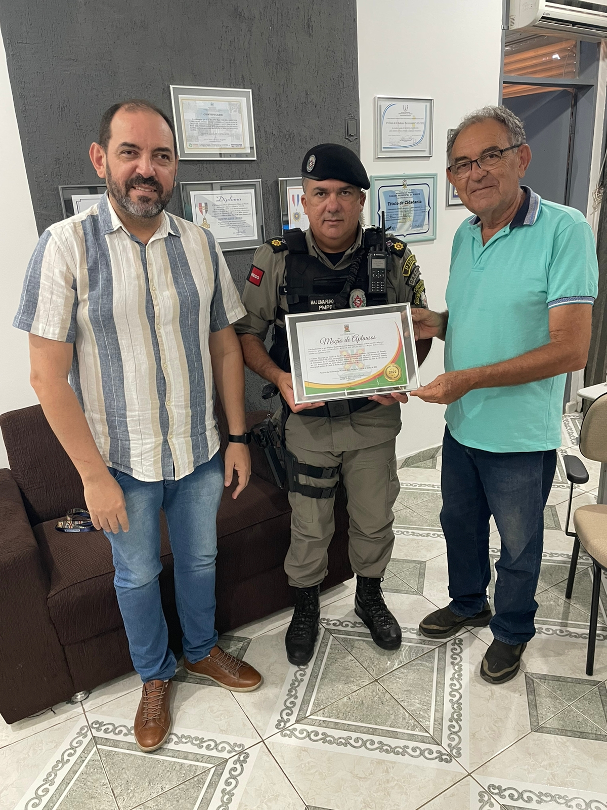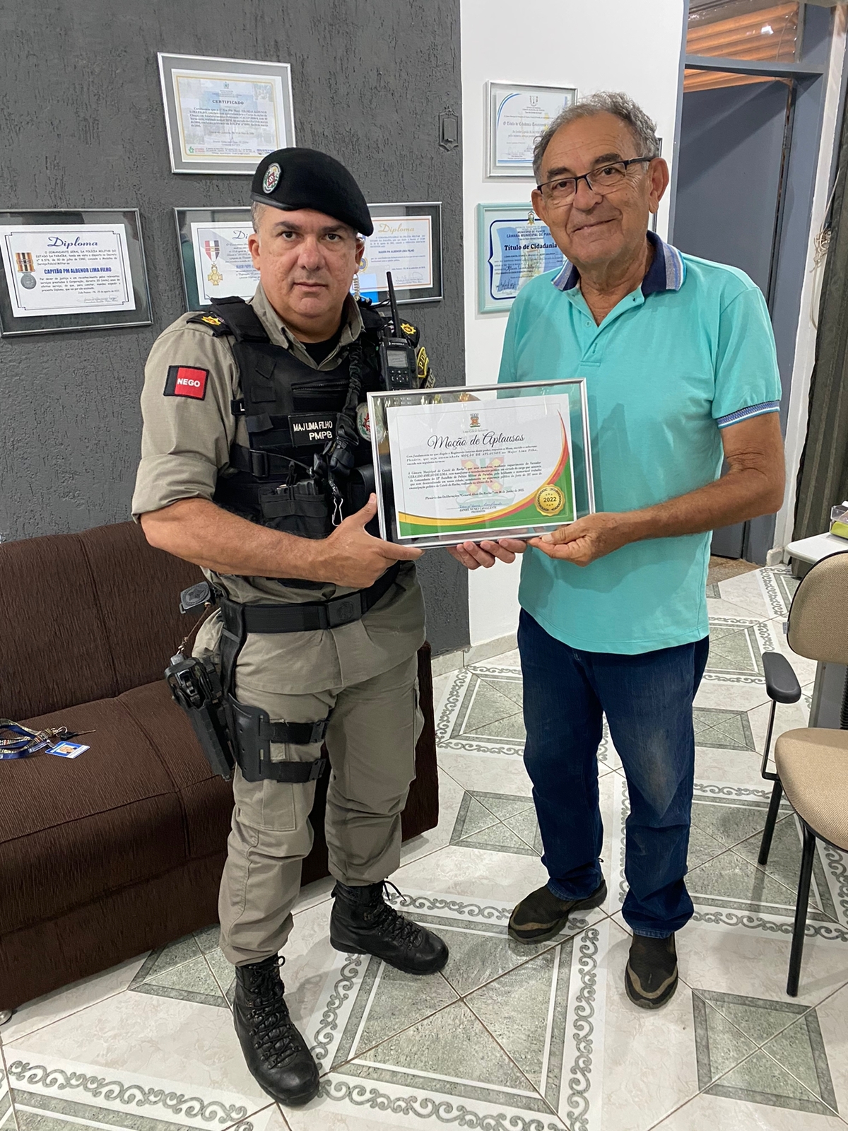 O comandante do 12º Batalhão de Polícia Militar, Major Albenor Lima Filho, foi agraciado com a honraria de moção de aplausos pela Câmara Municipal de Catolé do Rocha-PB. A comenda foi entregue nesta sexta-feira (13 de janeiro) pelo vereador Geraldo Amélio e pelo chefe de gabinete da Prefeitura Municipal Gerlando Lima.
