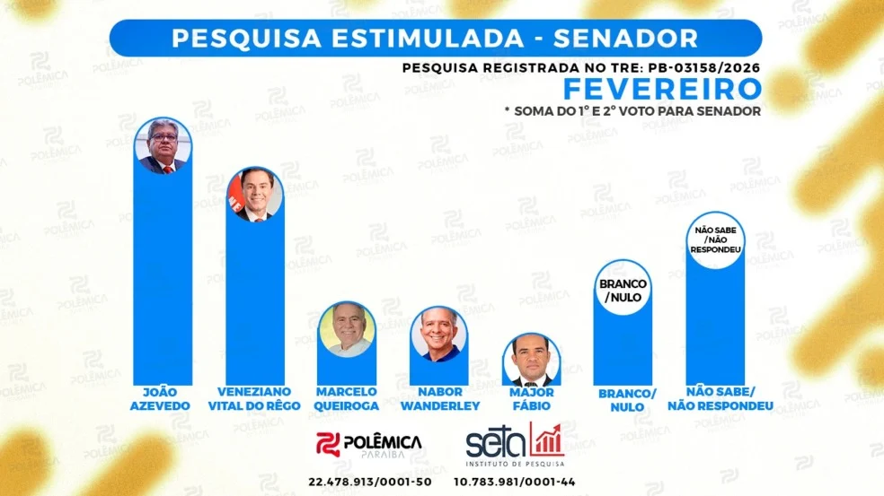 A pesquisa foi realizada entre os dias 26 e 28 de fevereiro, ouvindo 1.500 eleitores paraibanos, distribuídos em 90 municípios de todas as regiões do estado, garantindo uma amostra representativa do eleitorado.