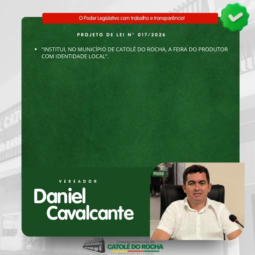 Durante a Sessão Ordinária realizada na tarde da segunda-feira, 13 de abril de 2026, na Câmara Municipal de Catolé do Rocha, entrou em pauta, em primeira discussão, o Projeto de Lei nº 017/2026, de autoria do vereador Daniel Nunes Cavalcante, que institui a Feira do Produtor com Identidade Local no município.