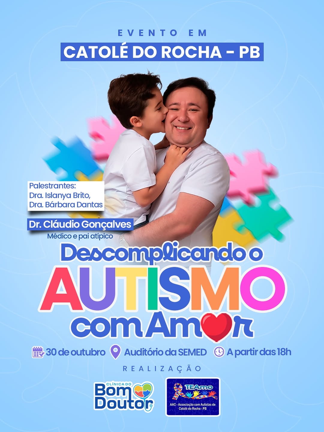 Catolé do Rocha será palco de um importante momento de aprendizado e sensibilização sobre o Transtorno do Espectro Autista (TEA). No dia 30 de outubro, a partir das 18h, acontece o evento “Descomplicando o Autismo com Amor”, no Auditório Municipal da SEMED – Fabiano de Sales Vilar, reunindo profissionais da saúde, educadores e famílias em uma noite de informação, acolhimento e troca de experiências.