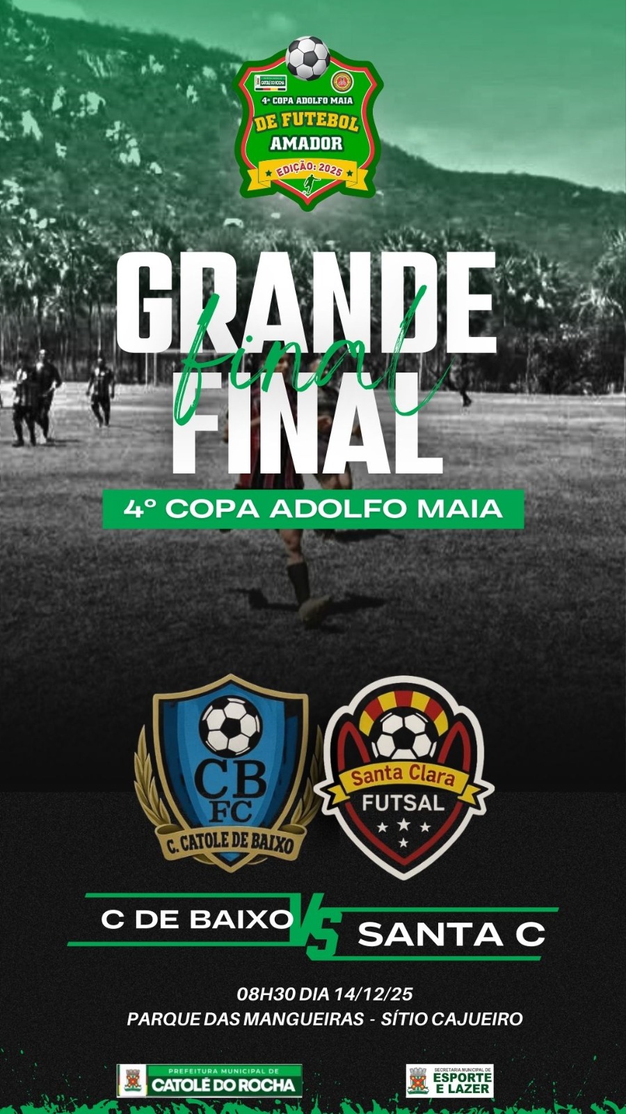 A Prefeitura de Catolé do Rocha, por meio da Secretaria Municipal de Esporte e Lazer, confirmou a realização da grande final da 4ª Copa Adolfo Maia de Futebol Amador, edição 2025. O confronto decisivo será entre as equipes do Santa Clara Futsal e do Catolé de Baixo FC (C. Catolé de Baixo), que chegam à final após ótima campanha durante a competição.