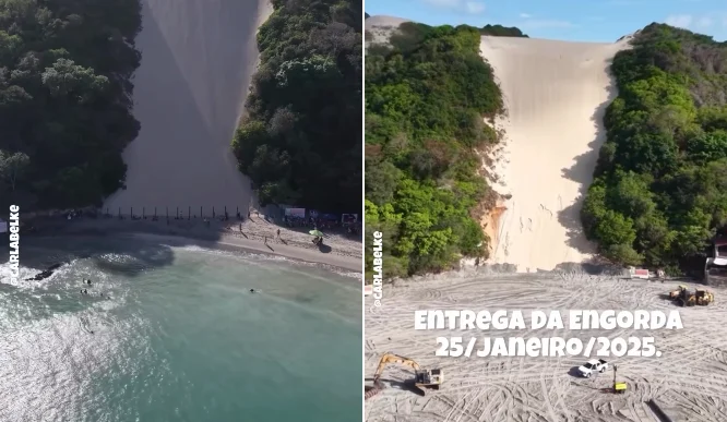Um vídeo de drone produzido pela fotógrafa Carla Belke mostra uma comparação do antes e depois da situação da engorda da praia de Ponta Negra, na cidade de Natal, no Rio Grande do Natal. Após a obra polêmica, um serviço recente foi feito para recuperar a faixa de areia. Mas a areia já retornou para o mar, e a água volta a se aproximar do morro.