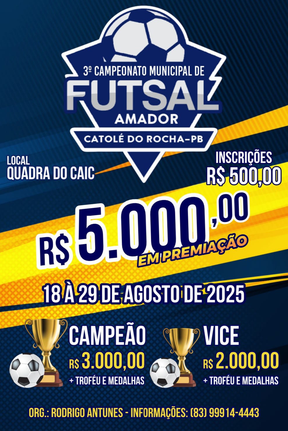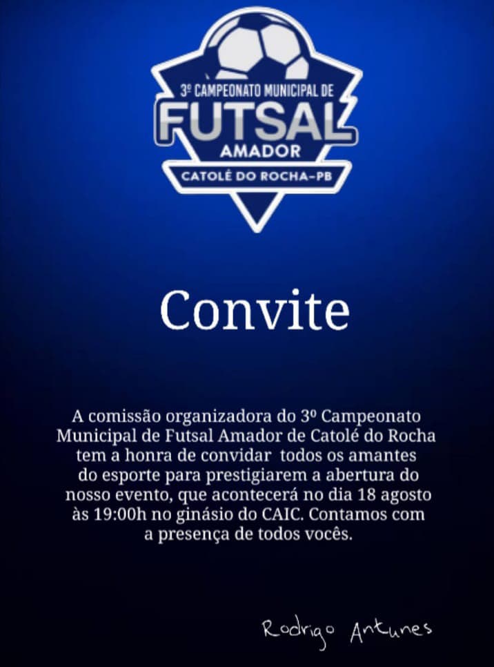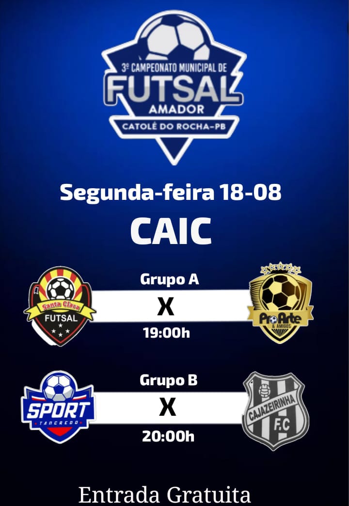 A cidade de Catolé do Rocha respira futsal a partir desta segunda-feira, 18 de agosto de 2025, com a abertura oficial do 3º Campeonato Municipal de Futsal Amador. O evento acontece na quadra do CAIC, a partir das 19h, com entrada gratuita para o público.