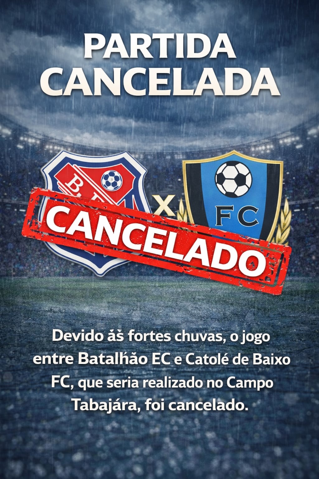 As fortes chuvas que caíram nas últimas horas em Catolé do Rocha provocaram o cancelamento do amistoso municipal que seria realizado neste sábado (7), no Campo do Tabajara. Em comum acordo, as equipes do Batalhão Esporte Clube e do Catolé de Baixo Futebol Clube decidiram adiar a partida, priorizando a segurança dos atletas e a preservação do gramado.