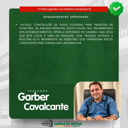 Durante a Sessão Ordinária realizada na tarde da segunda-feira, 13 de abril de 2026, a Câmara Municipal de Catolé do Rocha aprovou o Requerimento nº 143/2026, de autoria do vereador Garber Benjamim (Garber Jardel Cavalcante Diniz), que solicita a construção de faixas elevadas para travessia de pedestres na avenida principal da cidade.