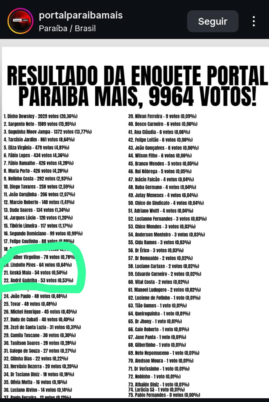 A enquete contou com um total de 9.964 votos, refletindo a opinião popular sobre os candidatos que se destacam na corrida em busca de uma vaga na Assembleia Legislativa da Paraíba (ALPB).