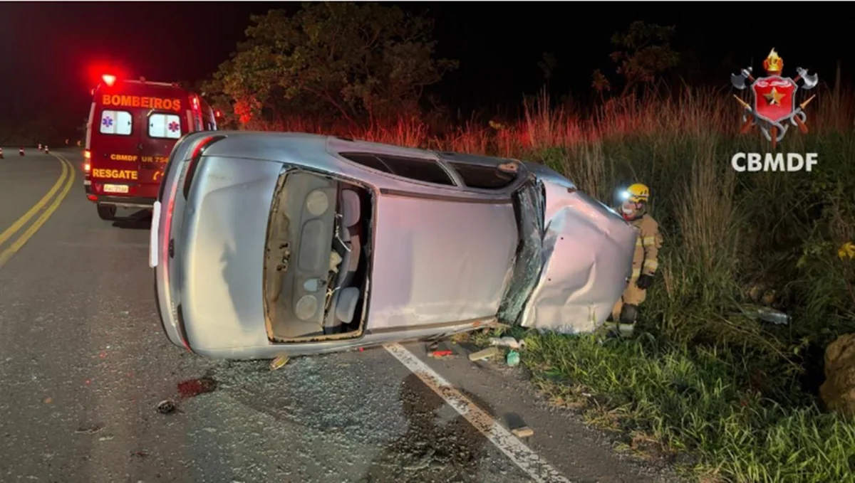 O impacto e a posição final do carro fizeram com que uma das vítimas ficasse imobilizada debaixo da estrutura, exigindo atuação imediata das equipes especializadas do Corpo de Bombeiros Militar do Distrito Federal (CBMDF).