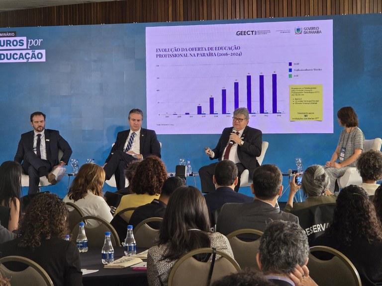 Durante o painel “Estratégia do programa Juros por Educação”, o chefe do Executivo estadual ressaltou que o governo tem aumentado desde 2019 a oferta do ensino integral e técnico, que colocou a Paraíba em destaque nacional. “Nós já temos 161 escolas com ensino profissionalizante técnico, superamos a meta do Plano Nacional de Educação na oferta do ensino técnico, criamos programas importantes como o Primeira Chance, que garante aos nossos estudantes a oportunidade de ter experiência no mercado de trabalho porque entendemos a importância dessas ações para garantir a qualificação da nossa juventude”, frisou.