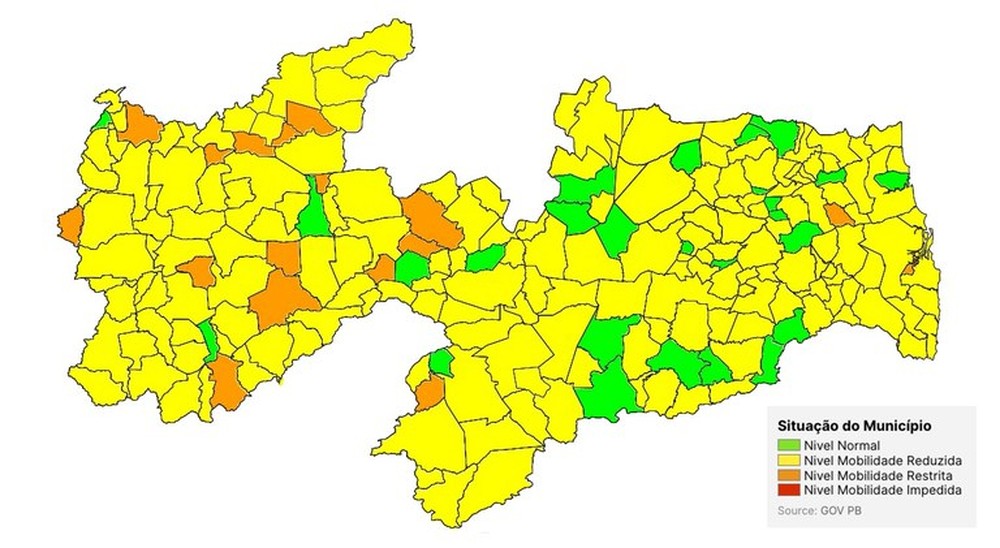 De acordo com os dados informados pela Secretaria de Estado da Saúde (SES/PB), não houve regressão da bandeira amarela para a bandeira laranja, apresentando a mesma redução de 8% dos municípios paraibanos. Ao todo, 13 cidades evoluíram para a bandeira amarela.