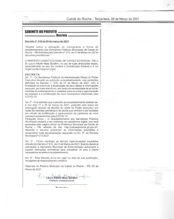 “Disposições sabre a alterações do cronograma e forma de recadastramento dos Servidores Públicos Municipais de Catolé do Rocha-PB definidas pelo Decreto nº 015, de 01 de Março de 2021 e dá outras providencias.”