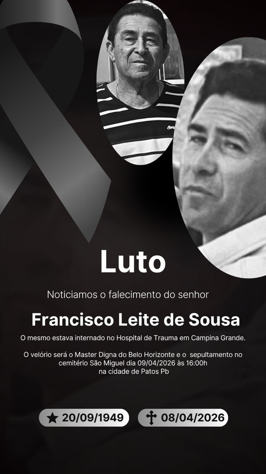 A cidade de Patos, no Sertão da Paraíba, amanheceu de luto nesta quarta-feira, 8 de março de 2026, com a notícia do falecimento de Francisco Leite de Sousa, conhecido popularmente como “Chico Veterinário”.