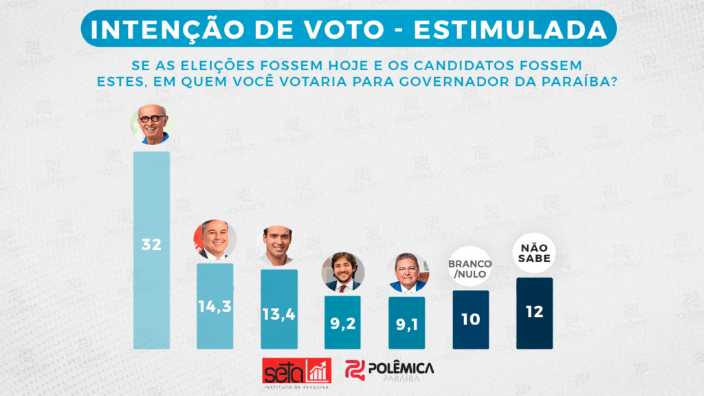 No cenário estimulado, Cícero aparece com 32% das intenções de voto, mantendo ampla vantagem sobre os adversários. O senador Efraim Filho (União Brasil), que vinha atrás do ex-deputado federal Pedro Cunha Lima (PSD) na pesquisa anterior, agora ultrapassa o ex-candidato ao governo e aparece em segundo lugar, com 14,3%.