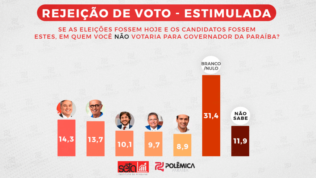 O levantamento também mediu a rejeição dos pré-candidatos. O senador Efraim Filho aparece com o maior índice, 14,3%, seguido de Cícero Lucena (13,7%). Logo atrás estão Pedro Cunha Lima (10,1%), Adriano Galdino (9,7%) e Lucas Ribeiro (8,9%).