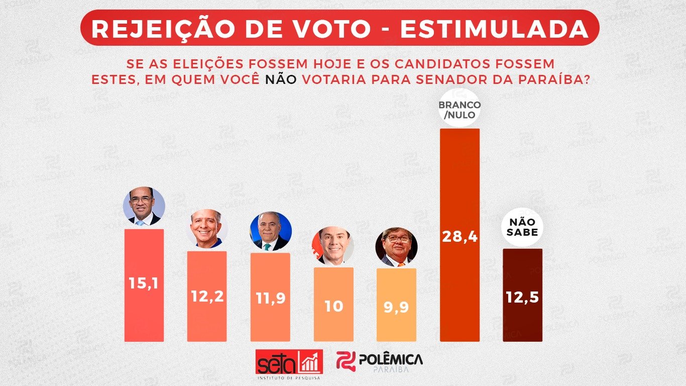 Major Fábio (Novo) tem 15,1% de rejeição. Nabor Wanderley (Republicanos) 12,2% de rejeição. Marcelo Queiroga (PL) ficou em terceiro lugar com 11,9%.