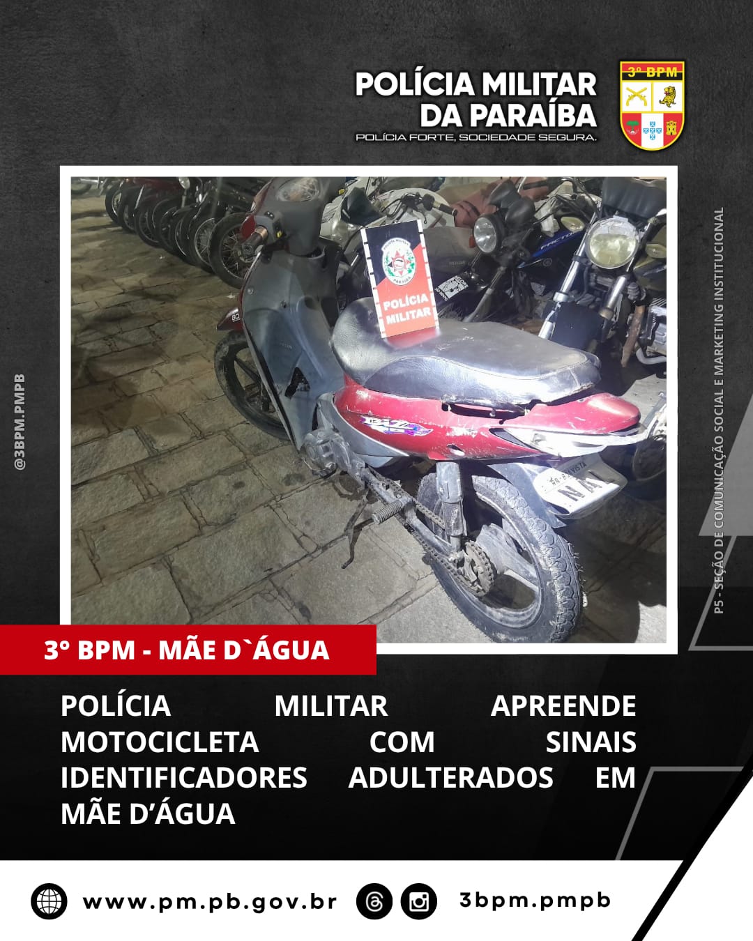 Na noite de ontem, terça-feira (31), a Polícia Militar da Paraíba, por meio de policiais militares da 4ª Companhia do 3º BPM, apreendeu uma motocicleta com sinais identificadores adulterados no município de Mãe d’Água.
