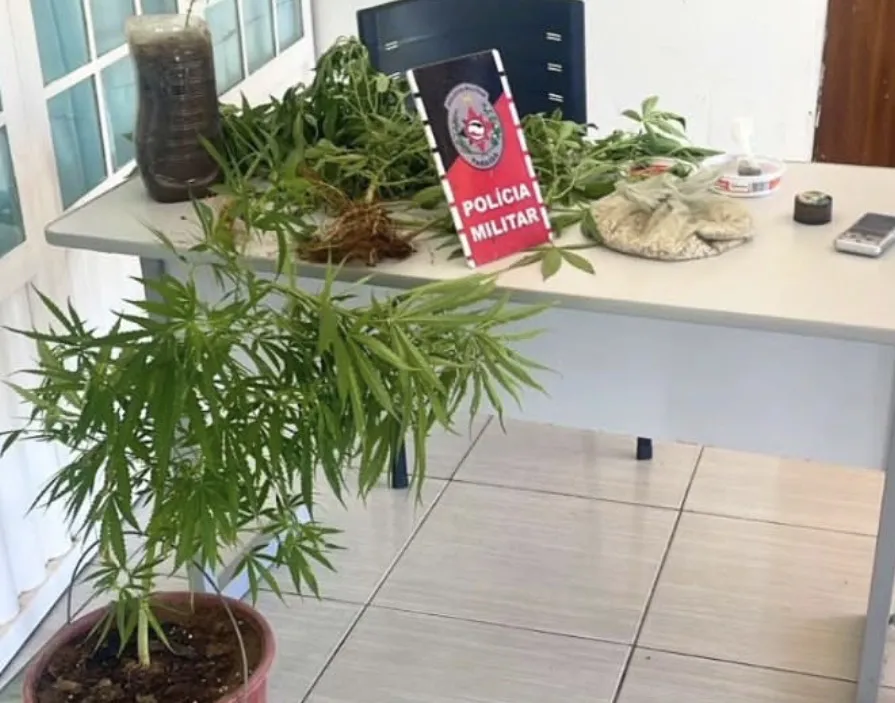 No local, a guarnição encontrou oito pés de Cannabis Sativa. A mulher também entregou voluntariamente uma pequena quantidade de substância semelhante à maconha, além de uma balança de precisão, um dichavador e adubo utilizado no cultivo.