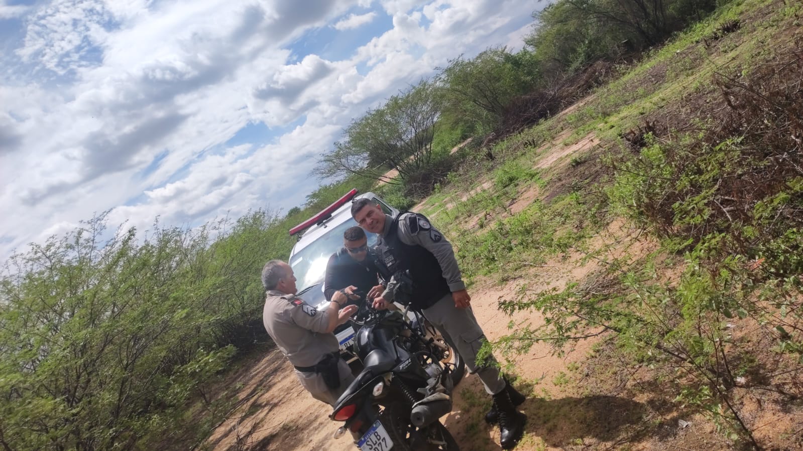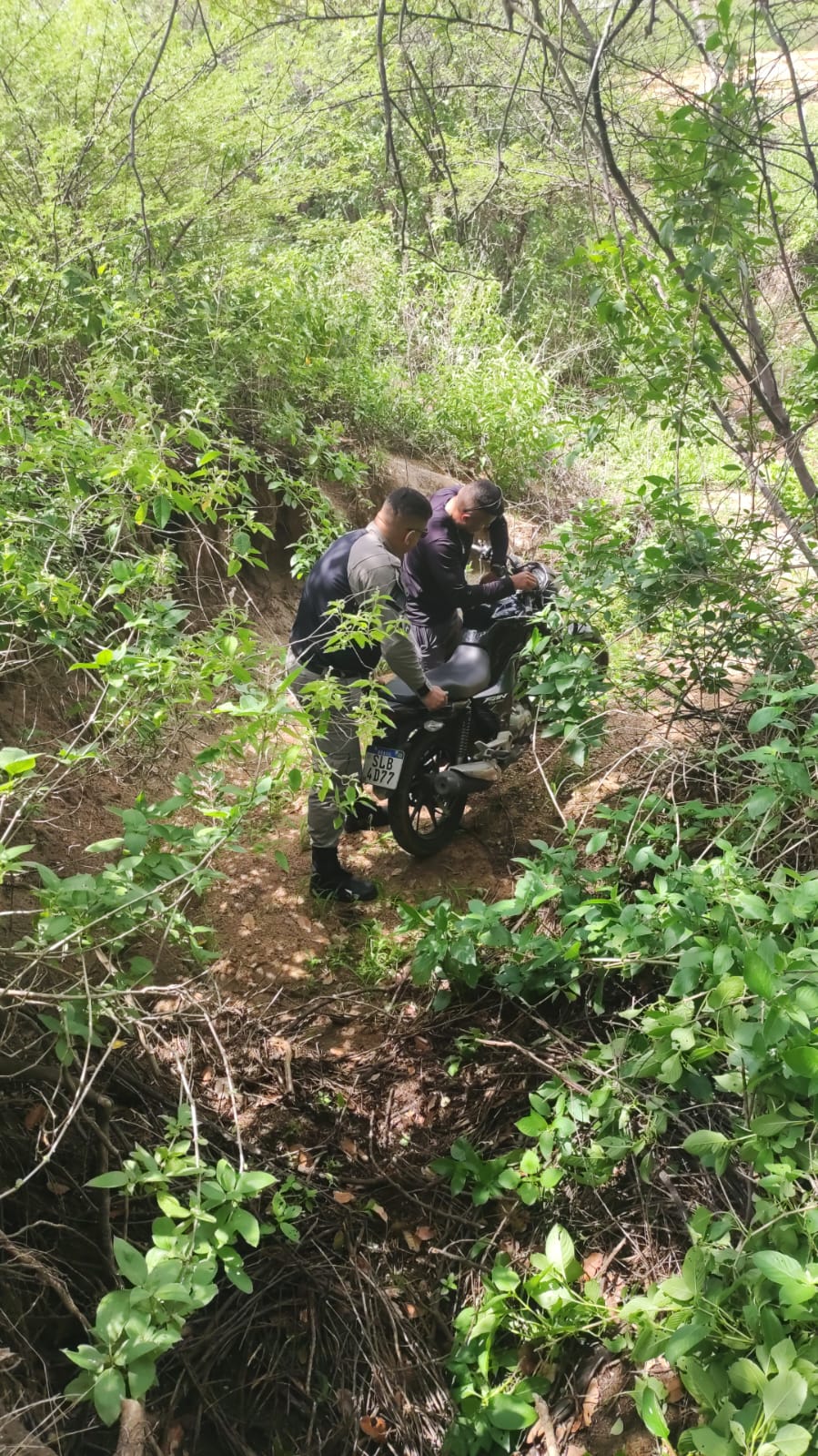 Ao chegar no local, foi encontrada a motocicleta dentro do mato e foi constatado que seria a moto que havia sido roubada durante a madrugada.