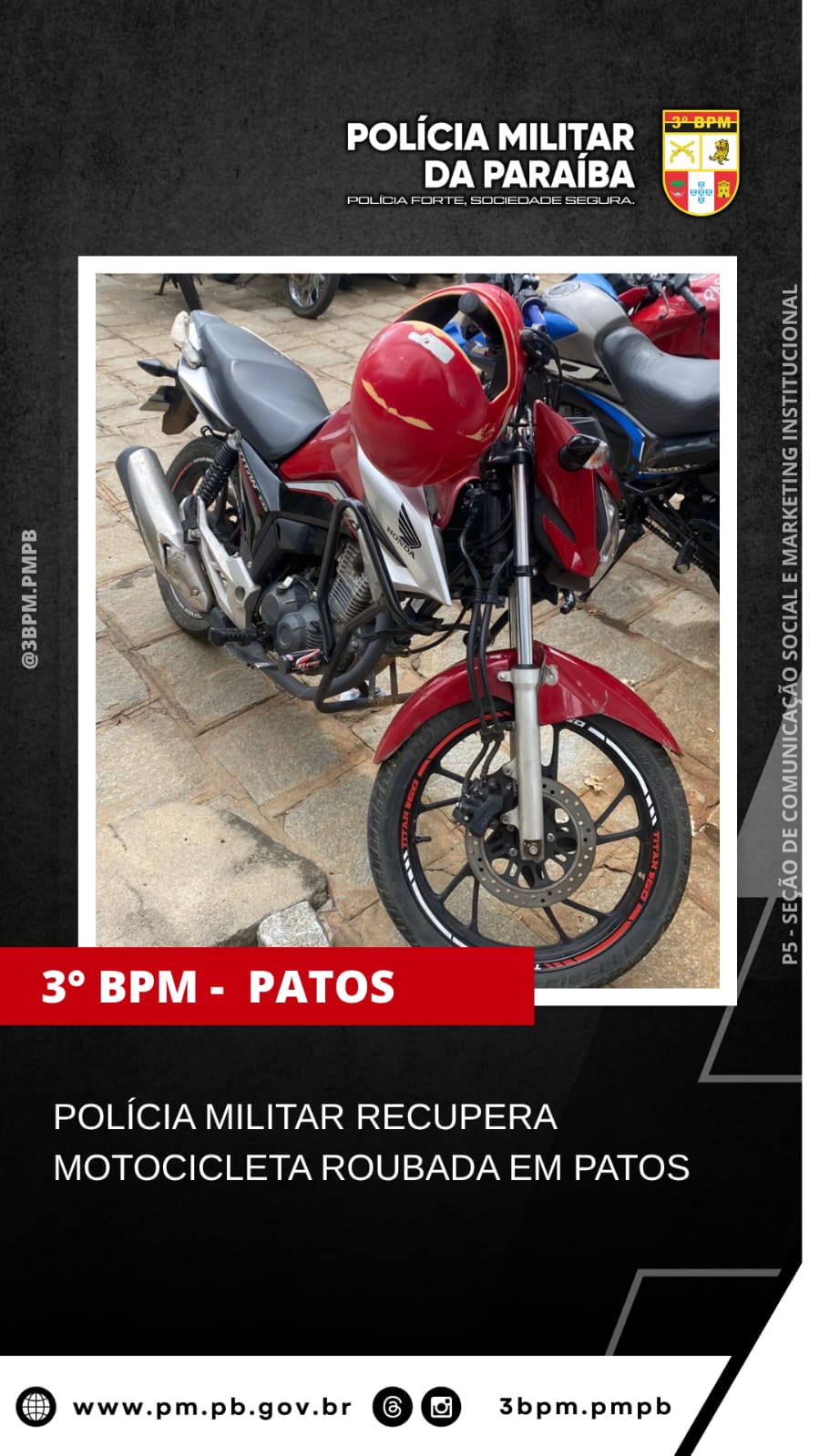 Na tarde de deste domingo (19), a Polícia Militar da Paraíba, por meio de policiais militares da 1ª Companhia do 3º BPM, recuperou uma motocicleta que foi roubada no dia anterior em Patos.