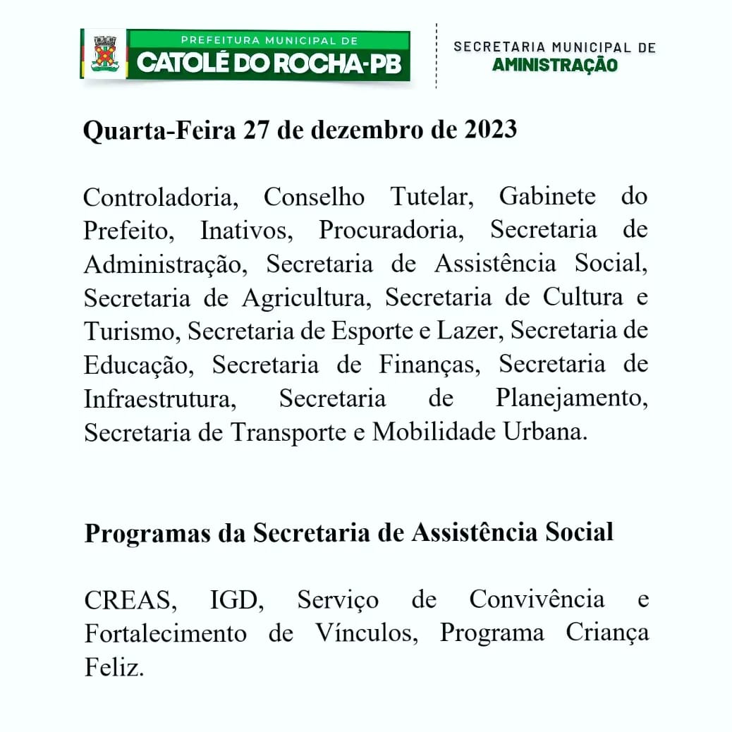 A Secretaria Municipal de Administração – Prefeitura de Catolé do Rocha – anunciou, terça-feira (26/12), o pagamento dos servidores, referente ao mês de dezembro, para os dias 27 e 28/12.