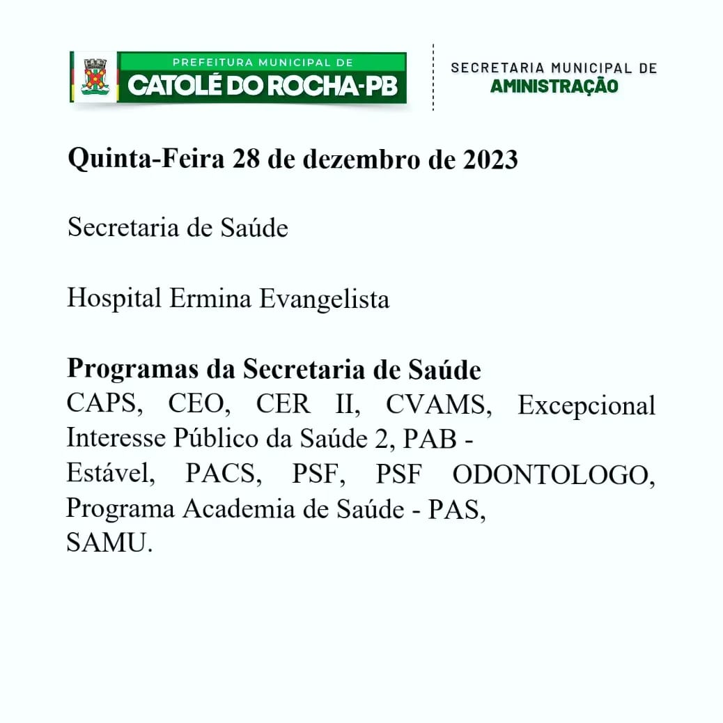 • Quinta-feira (28/12): Secretaria de Saúde, Hospital Infantil Ermina Evangelista e Programas da Secretaria de Saúde (CAPS, CEO, CER II, CVAMS, Excepcional Interesse Público da Saúde 2, PAB Estável, PACS, PSF, PSF Odontólogo, Programa Academia de Saúde – PAS e SAMU).