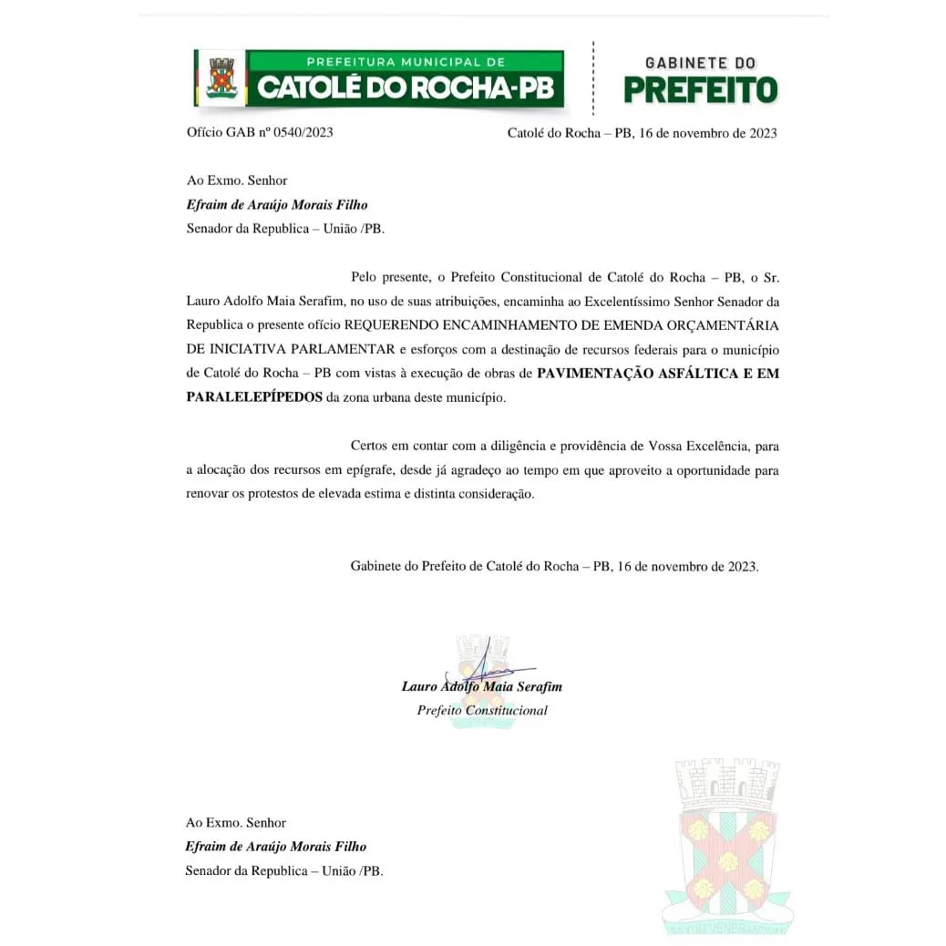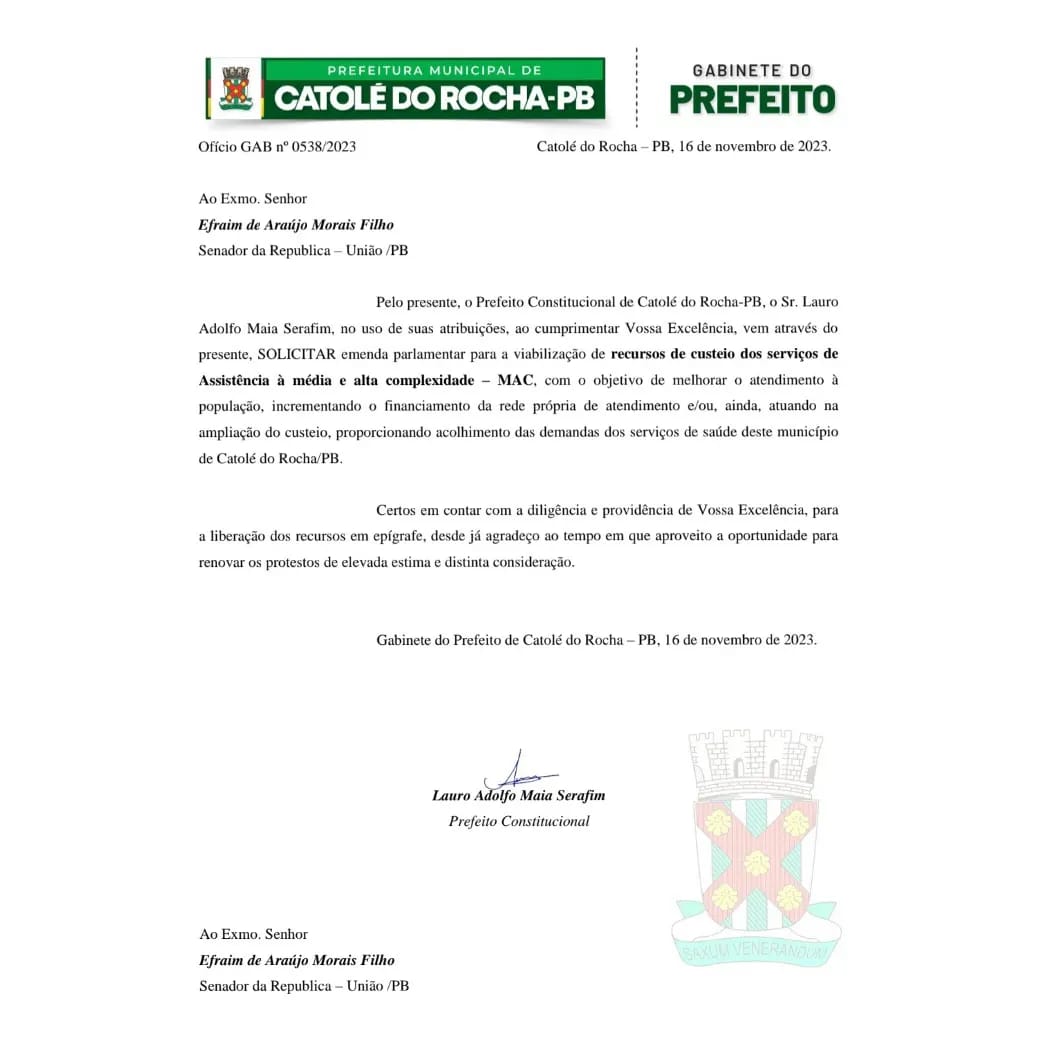 “Acredito que da mesma forma que Efraim Filho atuou, em Catolé do Rocha, como deputado federal, fará na função de senador. Agradeço pela parceria, benefícios, envio de recursos e emendas, receptividade e acolhimento. Conte comigo, senador!”, declarou o prefeito municipal.