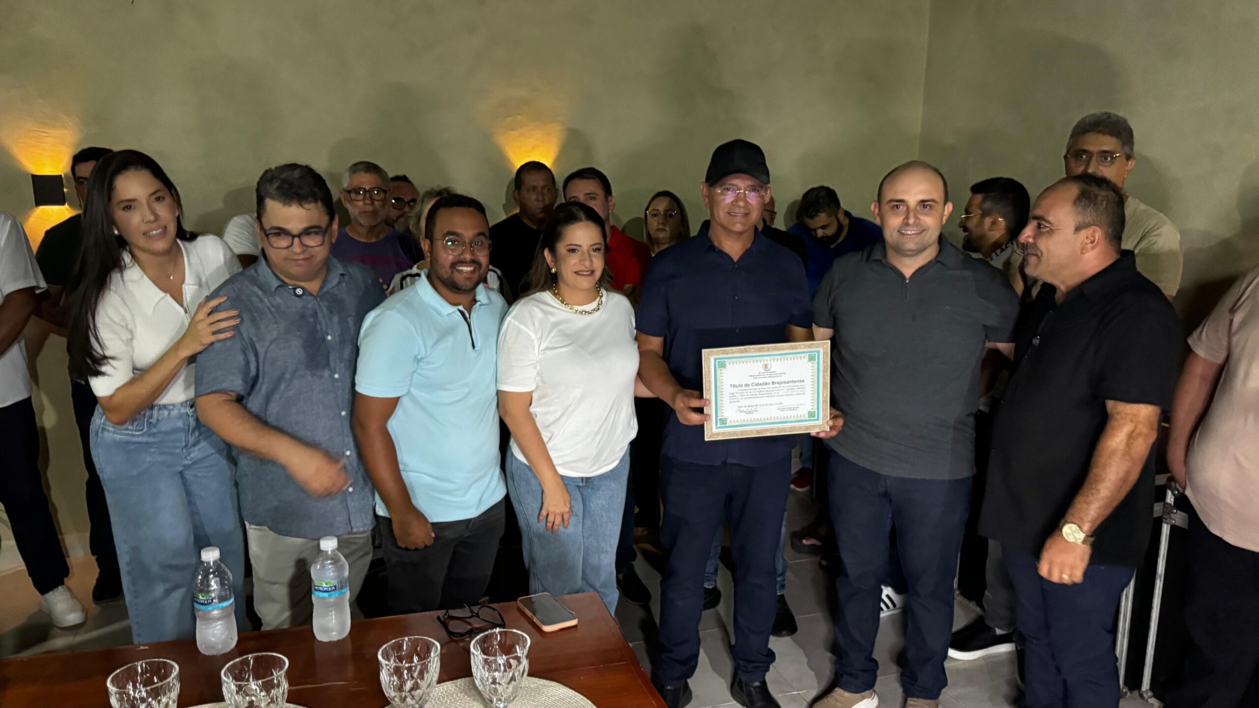 A honraria foi entregue durante o evento que reuniu uma multidão no Quintal do Espeto, quando o prefeito recebeu o reconhecimento das mãos de Rômulo Guedes e da vereadora Aninha de Rômulo, autora da propositura que concedeu o título.