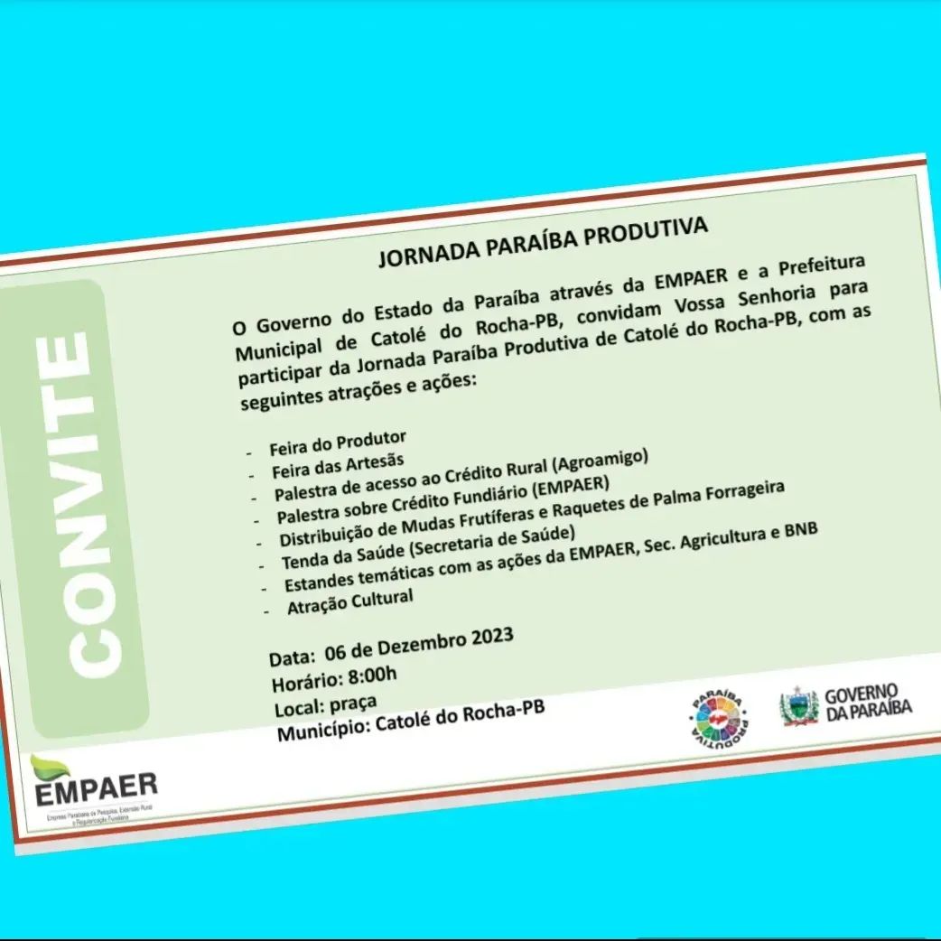 O Governo da Paraíba – Secretaria de Estado do Desenvolvimento da Agropecuária e da Pesca – e a Prefeitura de Catolé do Rocha vão realizar, quarta-feira (06/12), a “Jornada Paraíba Produtiva”, no município.