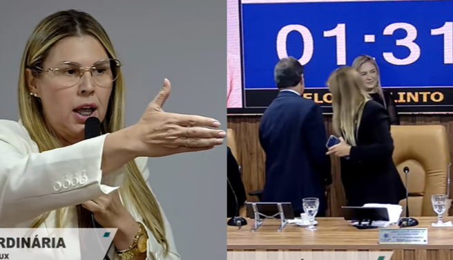 A vereadora também discutiu com a presidente da Casa, dizendo: “A fala continua sendo minha, presidente. Já que a senhora não tem a capacidade de discutir no âmbito da fala, é minha fala, presidente. Respeite o regimento”.