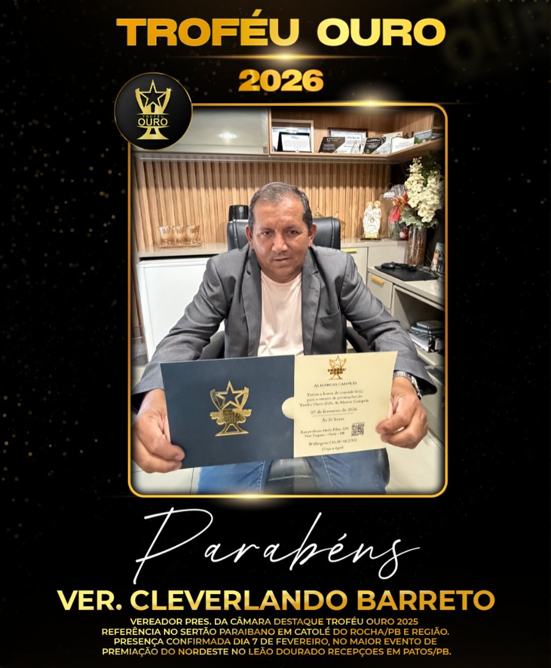 A entrega do Troféu Ouro 2025 acontecerá no dia 07 de fevereiro, no Leão Dourado Recepções, em Patos, durante o maior evento de premiação do Nordeste, com presença confirmada do vereador Cleverlando Barreto.
