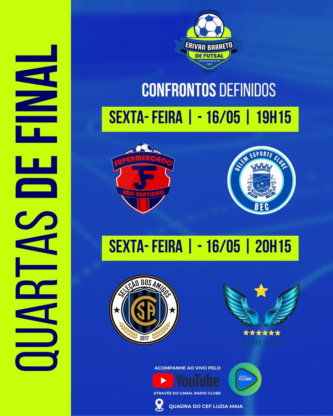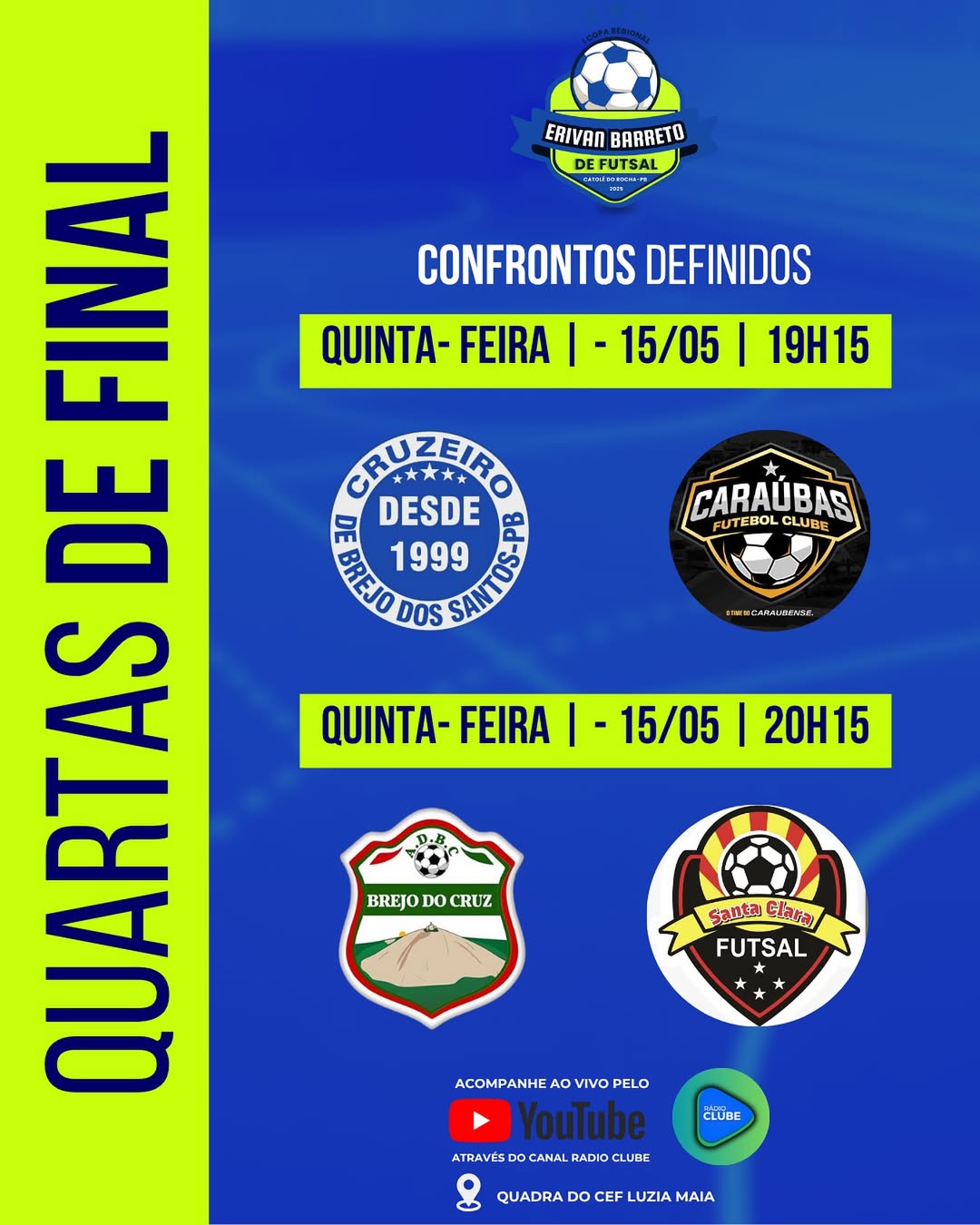 Nesta quinta e sexta-feira, dias 15 e 16 de maio, a emoção toma conta da Quadra de Esportes do Centro de Ensino Fundamental Luzia Maia, em Catolé do Rocha! É o início das quartas de final da I Copa Regional Erivan Barreto de Futsal, e o clima é de pura expectativa!
