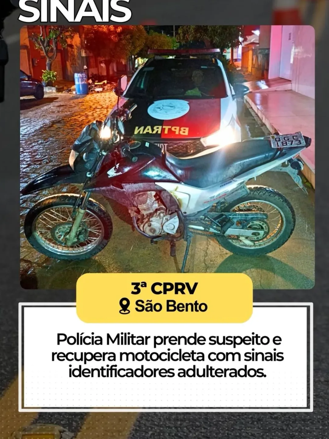 Na noite deste sábado (07), a Polícia Militar realizou a prisão de um suspeito e a recuperação de uma motocicleta com sinais identificadores adulterados, no município de São Bento, Sertão da Paraíba.