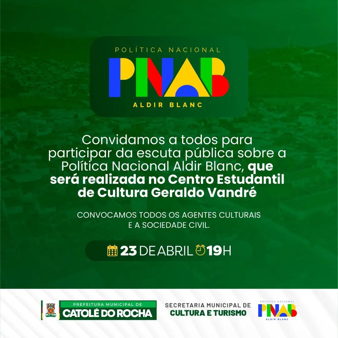 Importante – Na próxima terça-feira (23/04), às 19h00 (noite), será realizada a Escuta Pública sobre a aplicação da Lei Aldir Blanc no município de Catolé do Rocha.
