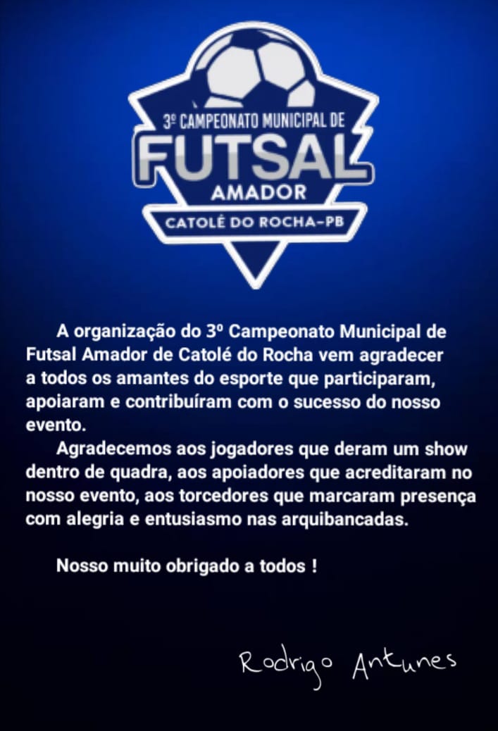 O campeonato, que teve a organização de Rodrigo Antunes, contou com o apoio da Prefeitura Municipal de Catolé do Rocha, por meio da Secretaria de Esporte. O evento reforça a importância de incentivar o esporte amador, promover lazer e valorizar os atletas locais, consolidando o futsal como uma das paixões esportivas do município.