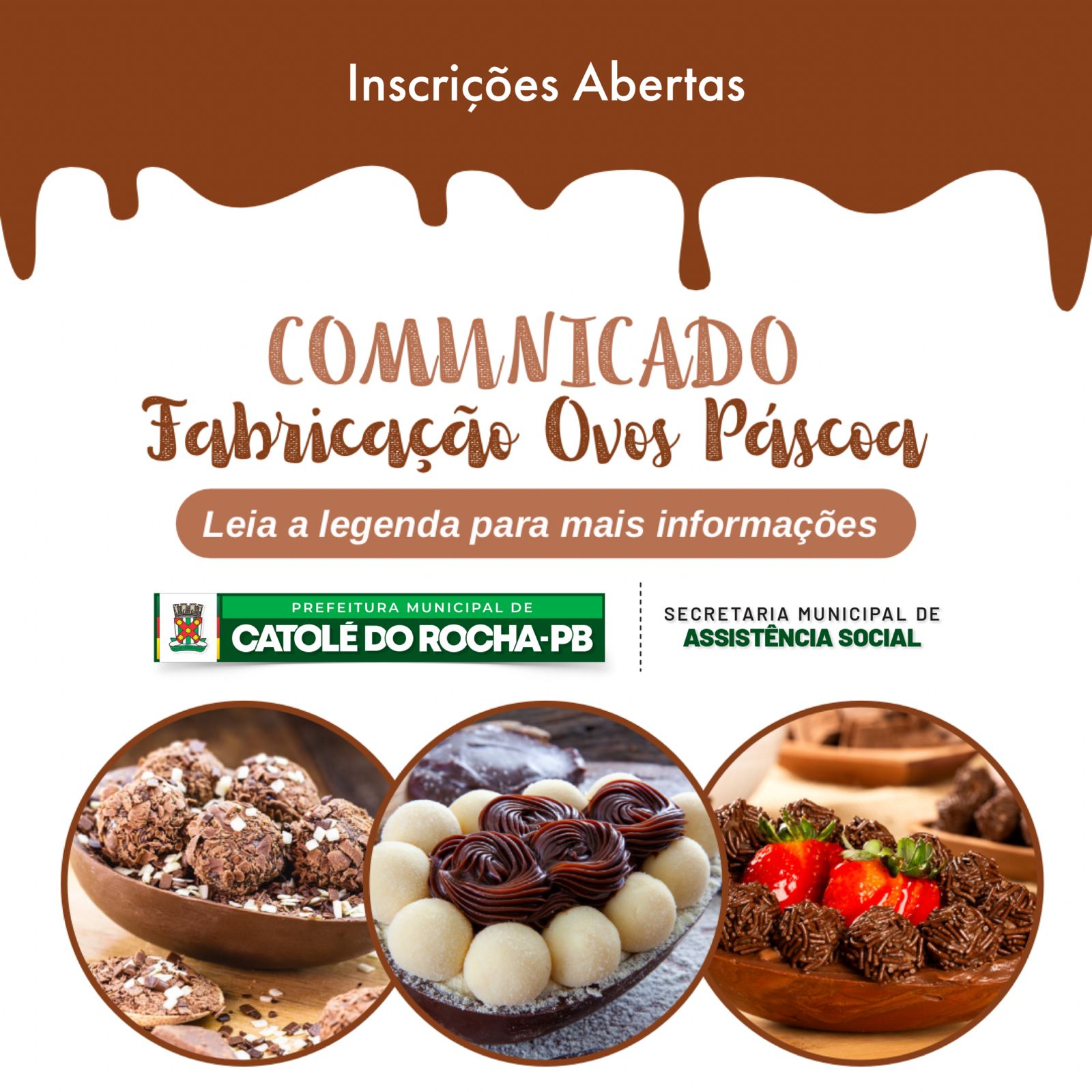 A Prefeitura de Catolé do Rocha – Secretaria Municipal de Assistência Social – informa que estão abertas as inscrições para os Cursos de Fabricação de Ovos de Páscoa e Salgados Fritos, que serão realizados de 29 à 31 de março de 2023.