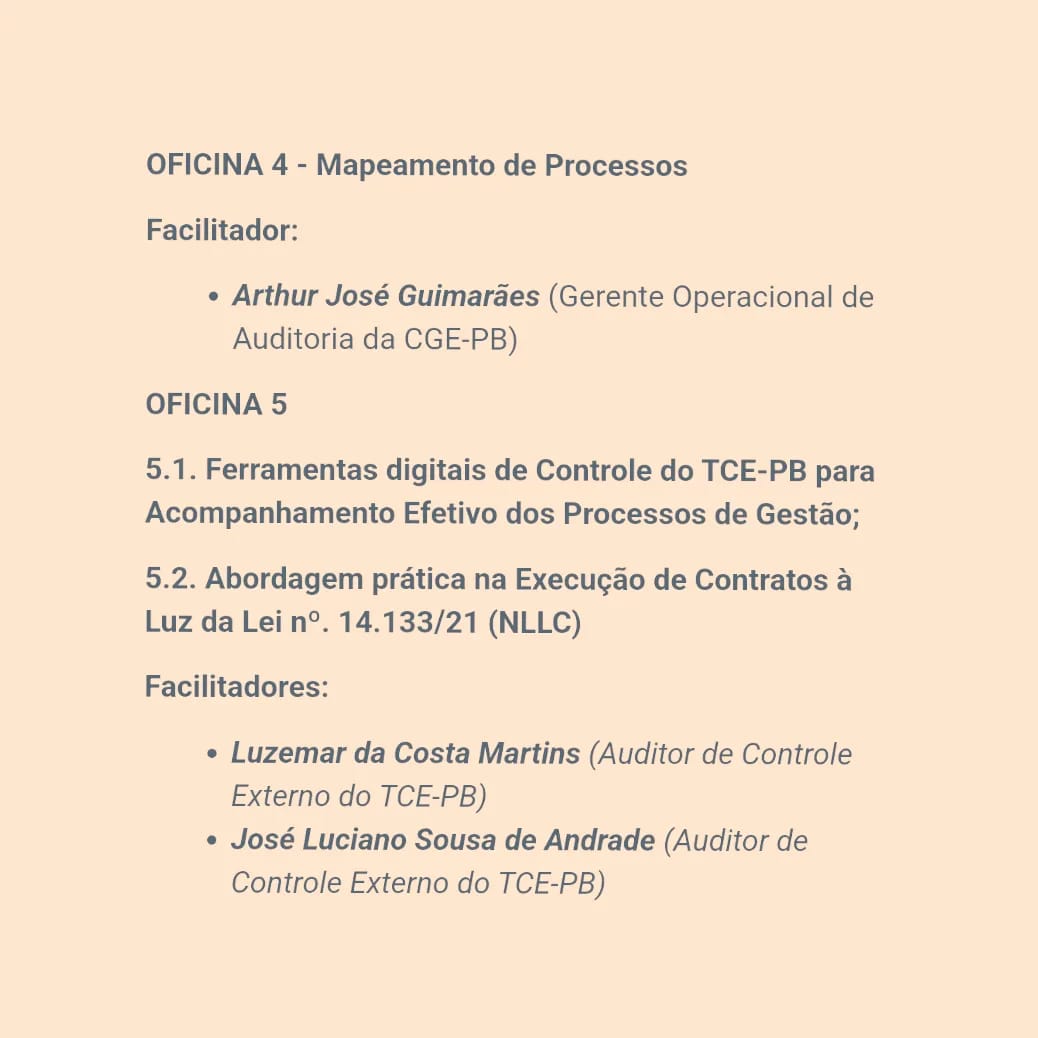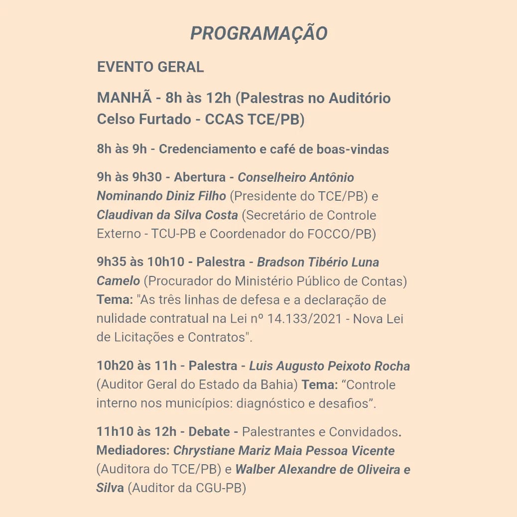 Entre os temas abordados, merecem destaque: “As três linhas de defesa e a declaração de nulidade contratual na Lei nº 14.133/2021 – Nova Lei de Licitações e Contratos” e “Controle interno nos municípios: diagnóstico e desafios”.