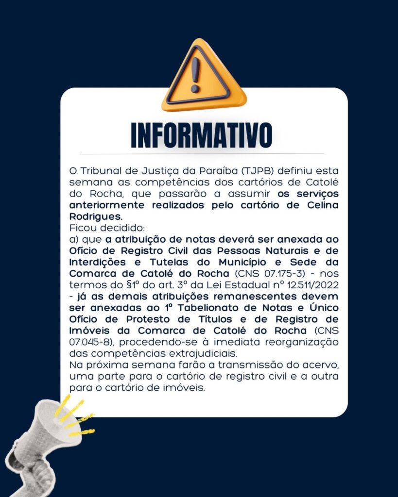 Já as demais atribuições remanescentes serão transferidas para o 1º Tabelionato de Notas e Único Ofício de Protesto de Títulos e de Registro de Imóveis da Comarca de Catolé do Rocha, que passa a absorver parte dos serviços antes executados por Celina Rodrigues.