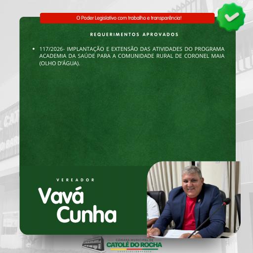 Durante a Sessão Ordinária realizada na tarde da segunda-feira, 13 de abril de 2026, a Câmara Municipal de Catolé do Rocha aprovou o Requerimento nº 117/2026, de autoria do vereador Vavá Cunha (Valdeci Dantas da Cunha), solicitando a implantação e ampliação do Programa Academia da Saúde para as comunidades rurais de Coronel Maia (Olho d’Água) e São Francisco.