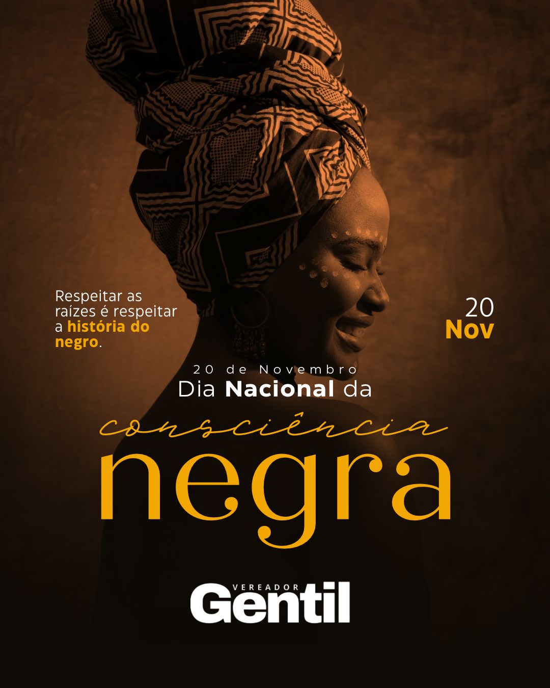 O vereador Gentil divulgou, nas suas redes sociais, uma mensagem especial em homenagem ao Dia Nacional da Consciência Negra, celebrado em 20 de novembro. Em uma peça gráfica marcada por tons quentes e pela imagem de uma mulher negra sorridente, usando turbante e adereços típicos, o vereador reforça a importância do respeito às raízes e à história do povo negro.